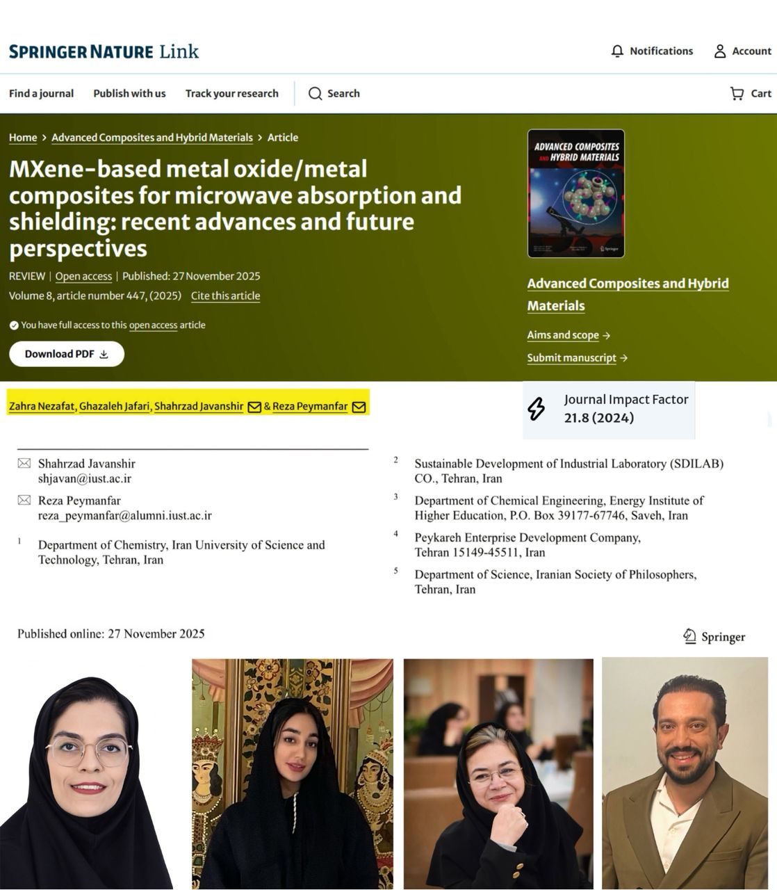 که تمامی نویسندگان آن دارای تعلق سازمانی (Affiliation) ایرانی هستند، در مجله Advanced Composites and Hybrid Materials